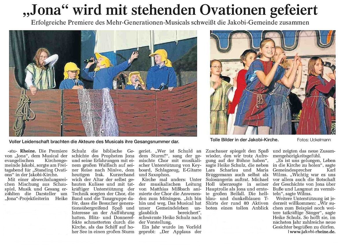 Im Oktober 2010 führten Schauspieler/innen, Sänger/innen, Tänzer/innen und Musiker/innen unterstützt von Technikern, Kulissenbauern, Kostümbildnerinnen aus der Kirchengemeinde Jakobi zu Rheine das Musical "Jona" auf.