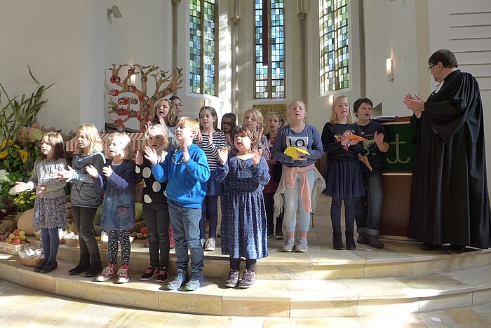 Der Gottesdienst, in dem der Kinderchor unter der Leitung von Kantorin Lena Puschmann mitwirkte, stand unter dem Thema „Die sieben Weltwunder“. Begegnen uns bereits im biblischen Schöpfungsbericht an jedem der sieben Schöpfungstage neue Wunder der Erde, so auch in der Welt unserer Tage. Der von Pfarrer Jürgen Rick gestaltete Gottesdienst nahm sich hierzu der persönlichen Hitliste einer Schülerin an, die für sich das Sehen, Hören, Tasten, Riechen, Schmecken, Lachen und Lieben als die größten Weltwunder empfand. Die Kinder spielten bei Fragen zu diesen Wundern begeistert mit und die Gemeinde brachte im gemeinsamen Hören, Singen, Beten, Staunen und Feiern den Dank an Gott zum Ausdruck.