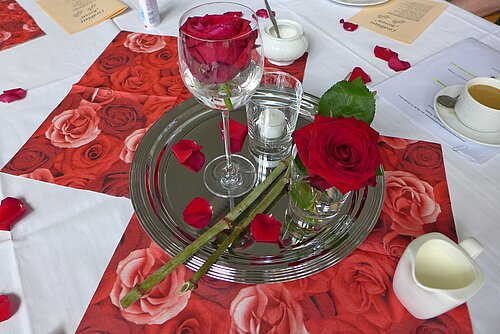 Die Tische waren mit Rosen im Glas und Rosenblättern geschmückt und mit Erdbeer-Sahne-Stücken eingedeckt. Fast 80 eingeladene Geburtstagskinder im Alter zwischen 75 und 93 Jahren ließen sich an diesem Nachmittag von dem Team um Jutta Kordts verwöhnen.
