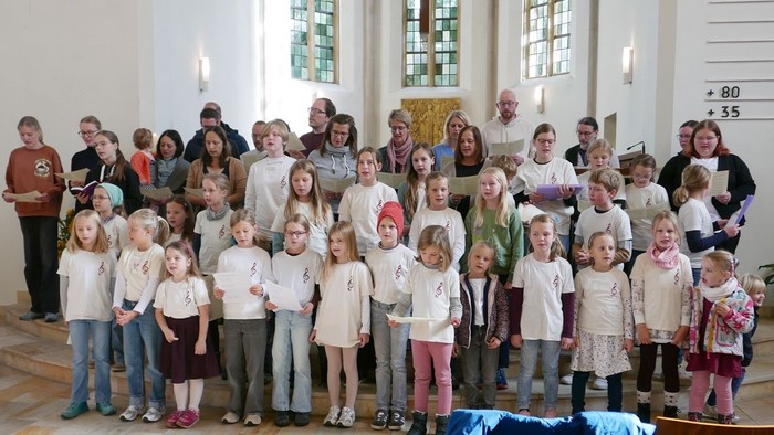 „Eingeladen zum Fest des Glaubens“ – mit diesem Lied hieß der Kinderchor gemeinsam mit den Eltern die Gemeinde zum diesjährigen Erntedankfest in der Jakobi-Kirche willkommen. Pfarrerin Claudia Raneberg von der evangelischen Jakobigemeinde freute sich, dass so viele Menschen beim Familiengottesdienst mitfeierten.