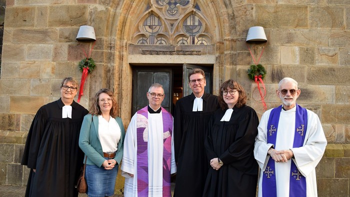 Titelbild: Sie wirkten im Einführungsgottesdienst für Pfarrerin Britta Meyhoff (2.v.r.) mit: V. l.: Pfarrerin Claudia Raneberg, Küsterin Tanja Schindler, Dechant Thomas Hüwe, Superintendent André Ost und der anglikanische Pfarrer i.R. John K. Newsome. Foto C. Fernkorn