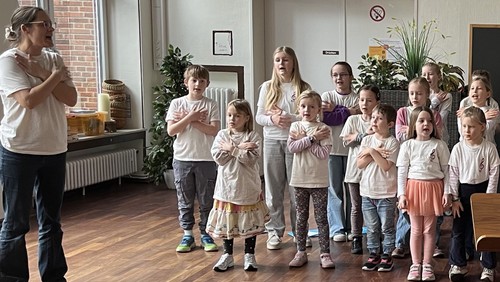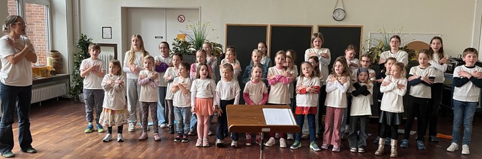 Beeindruckend war, wie die Kinder beim Stück „Bim bam bim bam“ Bewegungen und Text zusammenführten. Viele Lacher gab es bei dem Lied „Uwe wäscht sich nie“ (eigentlich heißt das Stück „Jule wäscht sich nie“, aber der Chor hat den Namen ausgetauscht, weil einige mit dem Namen im Chor und im Publikum anwesend waren).