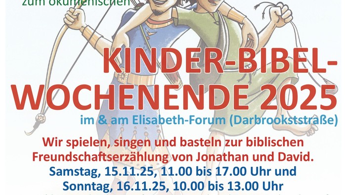 Das Kinder-Bibel-Wochenende werden wir in auch diesem Jahr in ökumenischer Verbundenheit mit der Pfarrei St. Dionysius veranstalten. Es findet statt am Samstag, 15.11. von 11 bis 17 Uhr und am Sonntag, 16.11. von 10 bis 13 Uhr im und am Elisabeth-Forum (Darbrookstr.). Das Planungsteam rund um Pastoralreferent Matthias Werth und Kantorin Lena Puschmann plant ein buntes Programm mit jeder Menge Spiel und Spaß. Herzlich eingeladen sind Kinder vom 1. bis 5. Schuljahr.