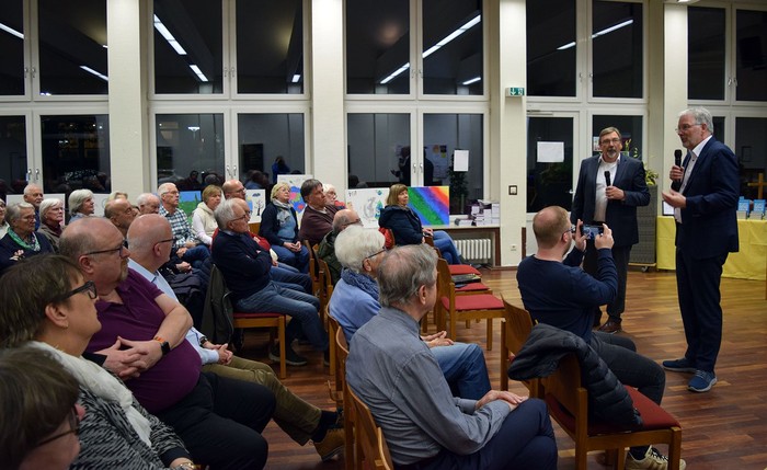 In der anschließenden engagierten Diskussion kamen auch die Wut und Überforderung der Bürger in Deutschland zur Sprache. Henze meint dazu: „Es ist ein hohes Wutpotential da. Wir sollten den Menschen Gelegenheit geben, über ihre Wut zu sprechen und sie wahrnehmen. Darin müssen wir als Kirche besser werden. Wir müssen den Ideologen ganz klar die rote Linie zeigen.“ Die Gesellschaft brauche eine Form öffentlicher Seelsorge. Und auf den drohenden Rechtsrutsch bei den Landtagswahlen in Ostdeutschland angesprochen sagt der EKD-Synodale: „Auch in Ostdeutschland gibt es mutige Richter und Medien. Wir sollten uns mehr darauf einstellen, Solidarität zu üben. Widerstehen muss gelernt werden.“