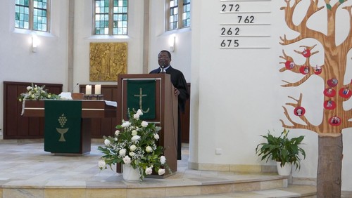 Weltweit gibt es Hunger, Kriege, Klimawandel und Ungerechtigkeit. Pfarrer Mutombo vom landeskirchlichen oikos-Institut für Mission und Ökumene zeigte in seiner Predigt auf, wie gerechtes Wirtschaften und Leben möglich wäre. Dabei ging er auf das Wirken der der ökumenischen Entwicklungsgenossenschaft „Oikocredit“, die nachhaltige Geldanlagen anbietet sowie Projekte im Globalen Süden fördert. Kirchen hatten sie vor 50 Jahren gegründet.