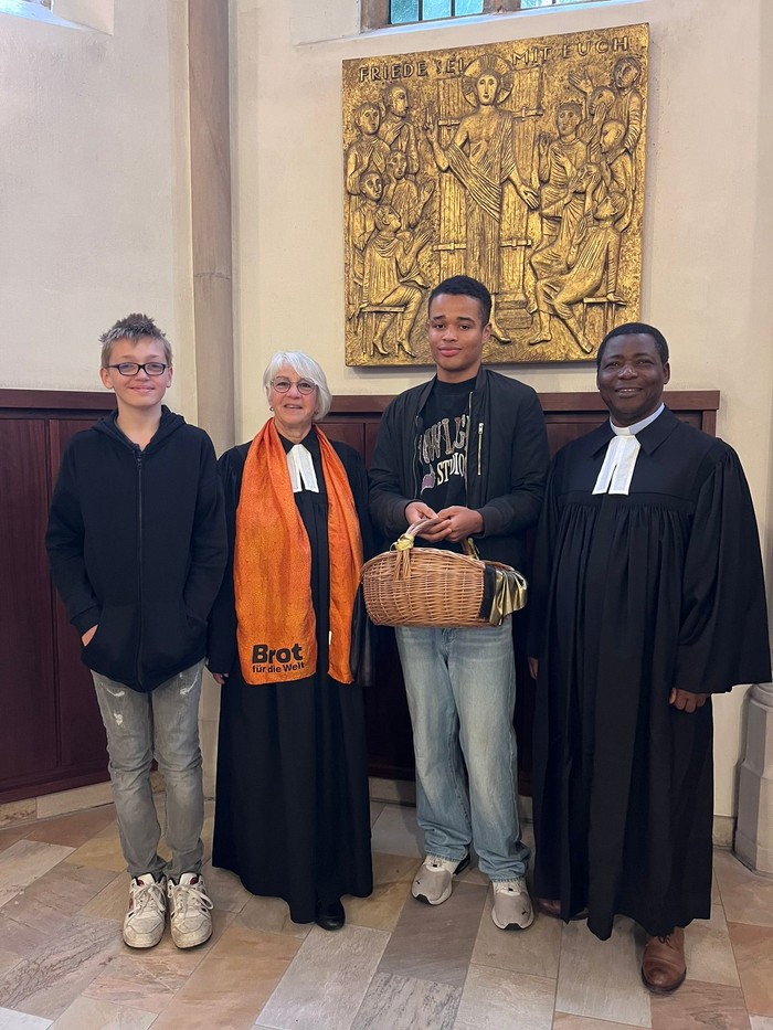 Einen Gottesdienst zum Thema „50 Jahre Oikocredit“ haben Pfarerrin i.R. Kerstin Hemker und Pfarrer Jean-Gottfried Mutombo vom oikos-Institut für Mission und Ökumene in Rheine gestaltet. Die Kollekte sammelten Ben (13, Konfirmand) und Student Samuel (19) ein.