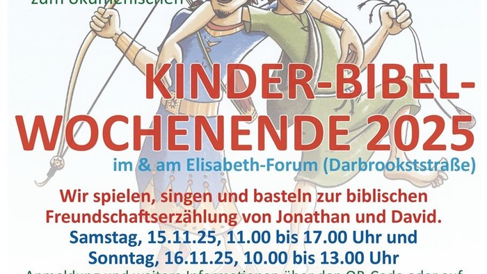 Das Kinder-Bibel-Wochenende rund um die Elisabeth-Kirche handelt in diesem Jahr von einer tollen Freundschaftsgeschichte, die wir in der Bibel finde: David und Jonatan werden richtige Freunde und sie gehen durch dick und dünn. Wir begleiten sie dabei und lernen dabei viel über Freundschaften.
