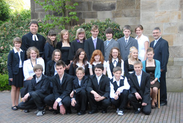 Am Sonntag, 3. Mai 2009 fand in der Jakobi-Kirche die Konfirmation der zweiten Gruppe statt: 14 Mädchen und Jungen wurden in einem feierlichen Gottesdienst von Pfarrer Jürgen Rick eingesegnet. Vor dem Gottesdienst stellten sich die Konfirmanden mit ihrem Pfarrer, dem Jugend-Presbyter der Gemeinde und den ehrenamtlichen "Konfi-Paten", die die Gruppe während des Konfirmandenunterrichts begleitet haben, dem Fotografen (Foto: Brand).