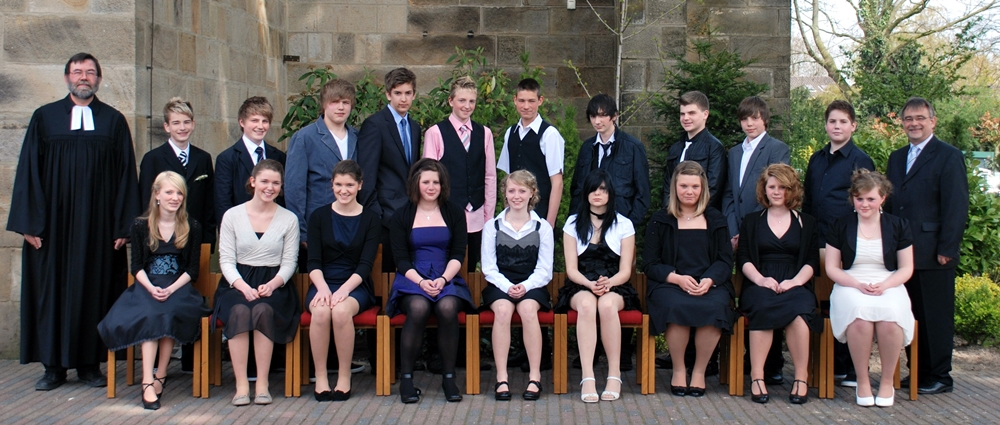 In ihrem besten Outfit traten am letzten Sonntag die Konfirmanden der zweiten Gruppe zur feierlichen Konfirmation in der Jakobi-Kirche an. Eltern, Großeltern, Verwandte und Freunde konnten wahrnehmen, wie aus Kindern Jugendliche geworden sind. 9 Mädchen und Jungen wurden von Pfarrer Siegfried Tripp in einem feierlichen Gottesdienst eingesegnet, der vom Posaunenchor unter der Leitung von Matthias Mißbach begleitet wurde. Vor dem Gottesdienst stellten sich die Konfirmanden mit Pfarrer Siegfried Tripp und Jugendpresbyter Joachim Schulz dem Fotografen.