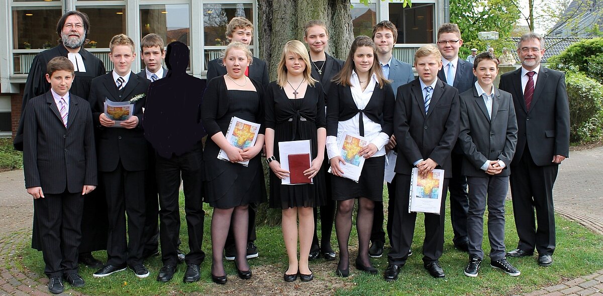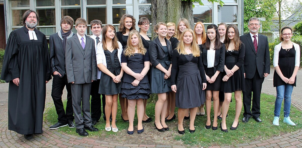 Hintere Reihe v.l.: Pfr. Siegfried Tripp, Joshua Fuhlert, Boris Köster, Tatjana Schlegel, Johanna Poll, Lena Brüning, Isabell Völlers, Lea Hermann, Nina Vaßholz, Presbyter Joachim Schulz und Konfirmandenpatin Kerstin Großkopf, vordere Reihe v.l.: Martin Lautenschläger, Anastasia Jaremenko, Lina Weitze, Julia Kuljukin, Laura Hermann, Vivien Jovanovic und Linda Grabowski