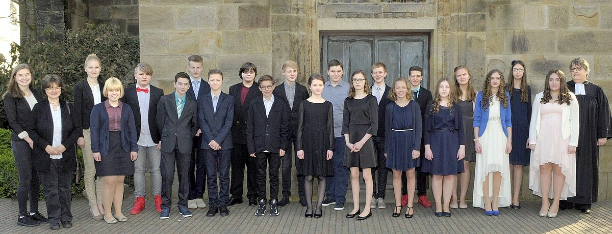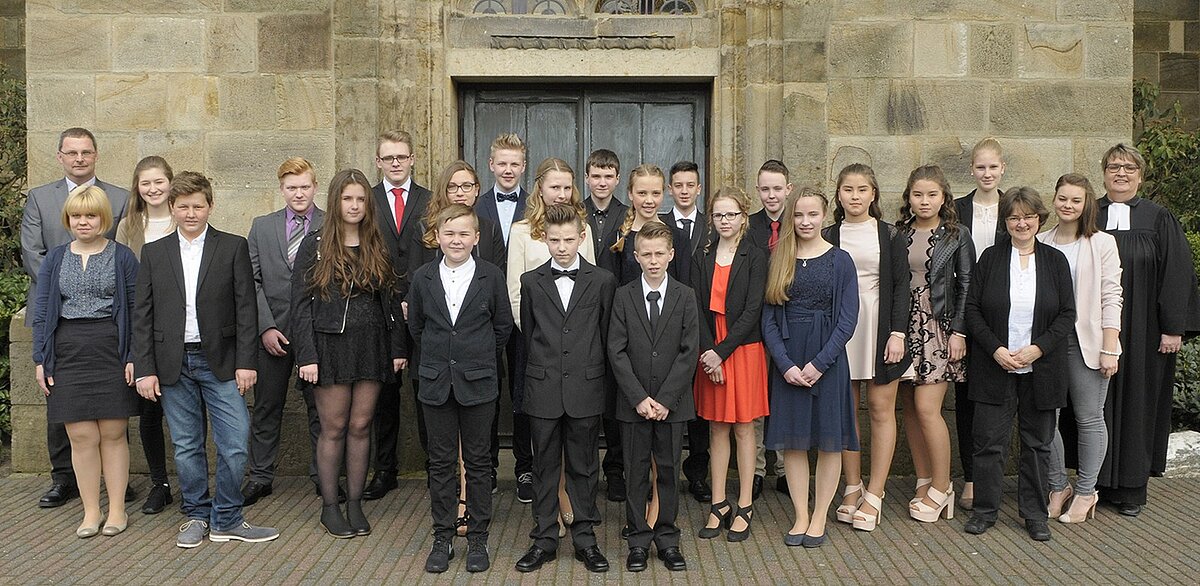 Samstag, 9. 4., hinten v.l.: Presbyter Thomas Koel, Konfi-Patin Sina Warmer, Daniel Lehn, Florian Schmiemann, Jakob Holl, Lucas Zimmermann, Daniel Laganowski, Jan Hoffmann, Jennifer Sinner, Jessica Sinner, Konfi-Patinnen Carolin Leugers, Anna Kegler und Maike Twent und Pfarrerin Claudia Raneberg mittlere Reihe, v.l.: Konfi-Patin Charlotte Determann, Cornelius Fink, Nicole Etschberger, Jennifer Klein, Amelie Beckmann, Hannah Book, Jana Thurau und Franziska Haneklaus Vordere Reihe v.l.: Linus Rehaag, Roman Streitenberger und Daniel Zeiger