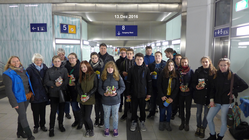 Die Jugendlichen waren noch ein zweites Mal im Einsatz: Am Dienstag, 13. Dezember, hat die zweite Unterrichtsgruppe - begleitet von Ursula Matschke vom Frauenabendkreis und Pfarrer Jürgen Rick - Plätzchen am Bahnhof gegen eine Spende für die Bahnhofsmission verteilt.